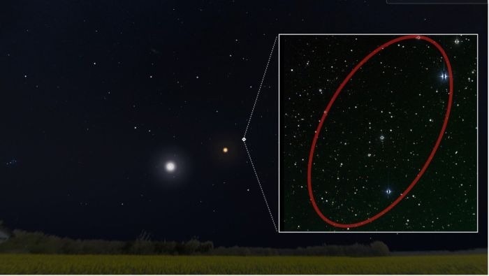 Arrival direction of a high-energy neutrino multiplet event determined by the IceCube experiment, overlaid on the visible night sky (generated with Stellarium). The right panel shows a zoomed-in optical image of the same region. The red ellipse indicates the 1σ uncertainty estimated by IceCube. Image Credit: ©Stellarium, Zwicky Transient Facility