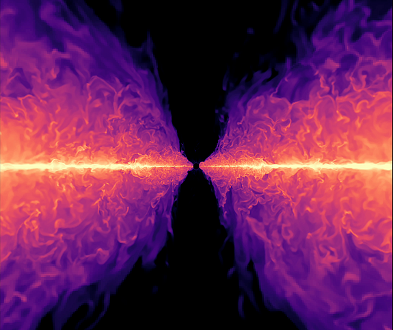 This image shows the gas density in a two-dimensional cross-section of an accreting black hole. Brighter areas represent regions of higher density. Near the black hole, the accretion flow forms a dense, thin thermal disk embedded within a magnetically dominated envelope that helps stabilize the system. Although the flow is radiation-dominated and highly turbulent, the thermal disk structure remains remarkably stable. Image Credit: Zhang et al. (2025)