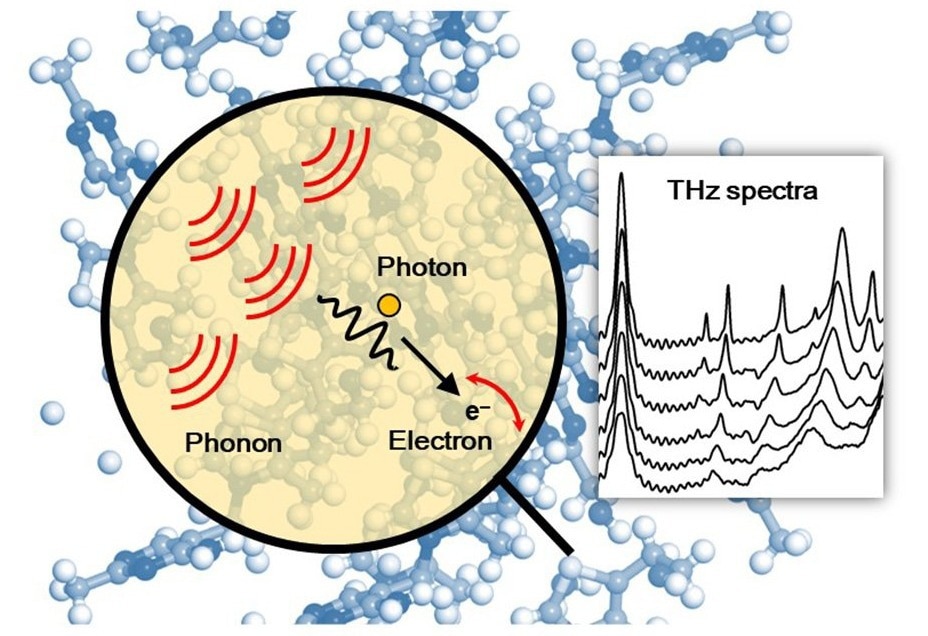 The light (photons) emitted from phonons interact with vibrating electrons in the crystal, and this can be observed in the terahertz spectrum on the right. Image Credit: Masae Takahashi
