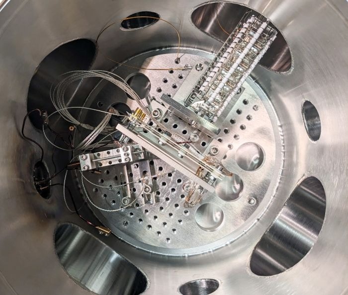 The new dual-frequency Paul trap developed by physicists at JGU and Helmholtz Institute Mainz can capture heavy calcium ions or light electrons. Image Credit: Hendrik Bekker,JGU